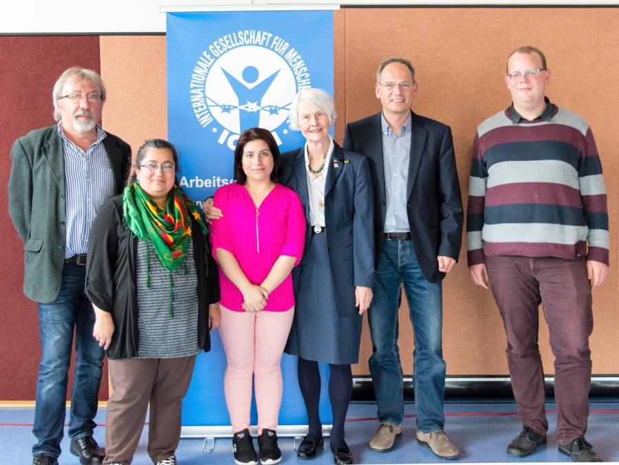 Kathrin Bornmüller, Ehrenvorsitzende der Deutschen Sektion der IGFM und Organsiatorin zahlreicher Hilfstransporte in die Krisenregion, ergänzte die Ausführungen durch ihre Erlebnisse und Erfahrungen, die sie bei Hilfstransporten und Besuchen im Sindschar-Gebirge gesammelt hat. Gerade die entwurzelten Menschen in den wilden Flüchtlingscamps, die Familien und Kinder in den zerstörten Dörfern benötigen dringend humanitäre Hilfe, Zugang zu sauberem Trinkwasser und medizinische Betreuung.